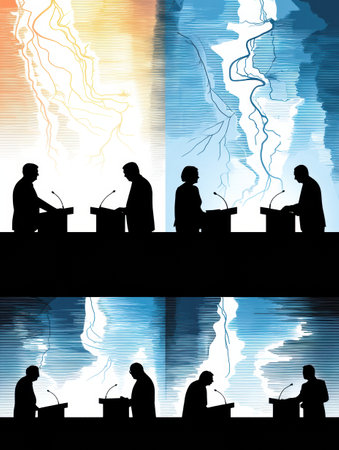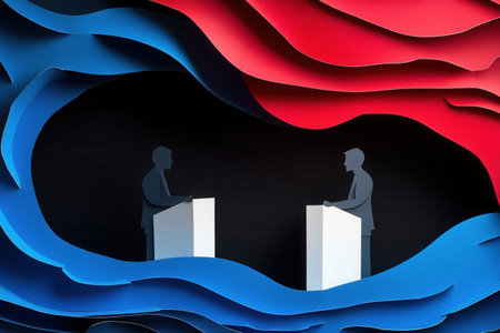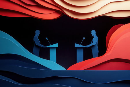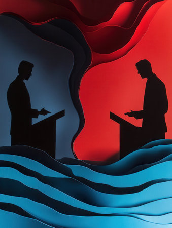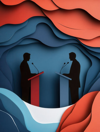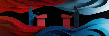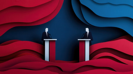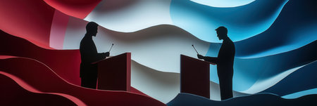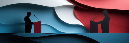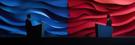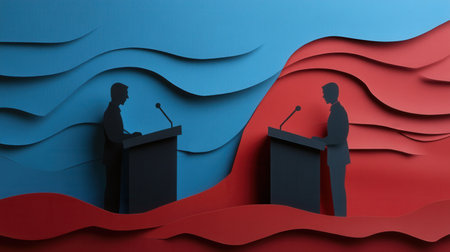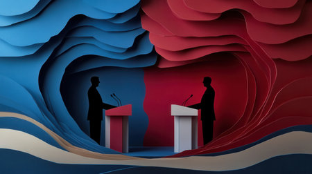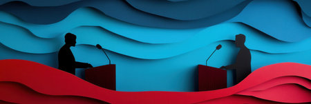 Silhouetted figures stand behind podiums in a dynamic political debate, surrounded by abstract waves of red and blue paper art.