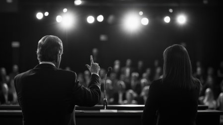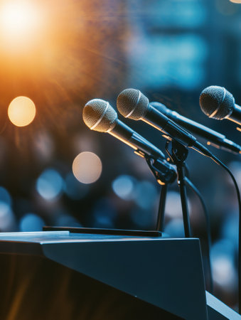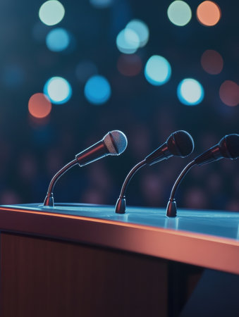 A modern podium with microphones shines under bright lights, setting a dramatic stage for a political speech to an engaged audience.