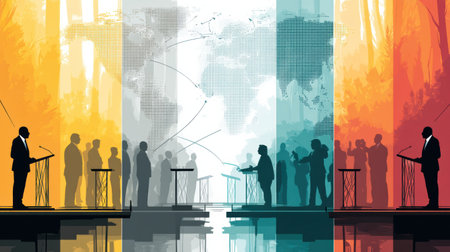 Two figures stand at podiums in a vibrant political debate setting, surrounded by colorful paper waves and bold silhouettes that energize the scene.
