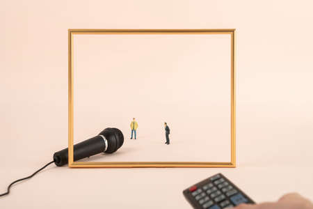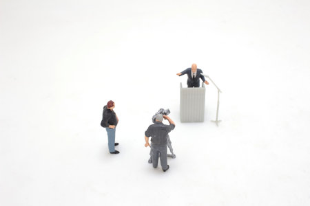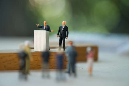 Miniature politician or party candidate in excited speech persuades to vote for him. Election debates or press conference concept