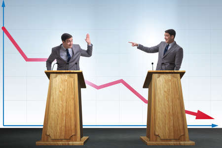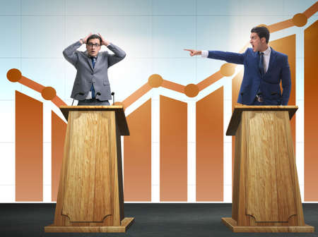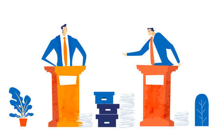 Debate of two politicians - two male persons with violent gesticulation standing on speaking tribunes and argue with each other - vector political illustration