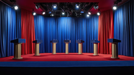 A vacant debate stage featuring six podiums surrounded by dramatic red and blue curtains. Spotlights illuminate the setup, indicating a political event.
