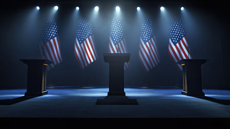 A striking image of an empty debate stage featuring multiple American flags and podiums, creating a powerful atmosphere of anticipation for political discussions and civic engagement.