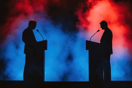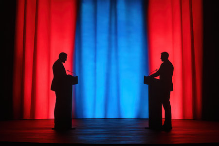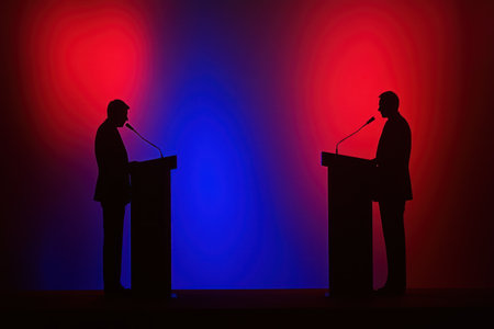 Layered silhouettes of two figures debate at podiums, complemented by vibrant red and blue paper waves enhancing the dramatic atmosphere.