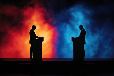 Two silhouettes engaged in a political debate stand behind podiums, with a dynamic and colorful paper art background enhancing the moment.