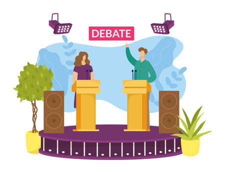 Public debates of political candidates vector flat illustration. Politicians discussing at tribunes. Pre election campaign.