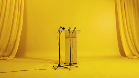 Press stage with microphones, perfect lighting, and neutral background, ideal for political events, news conferences, or professional media use