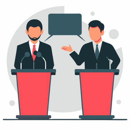 Bold art showcases two figures at podiums engaged in a lively political debate against a backdrop of colorful paper waves.