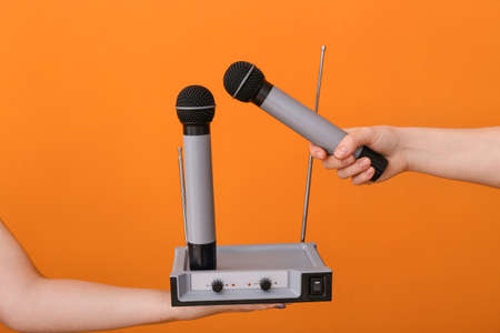 Closeup male and female hands holding microphone isolated over blue and pink background. Emotions, youth, love and diversity concept