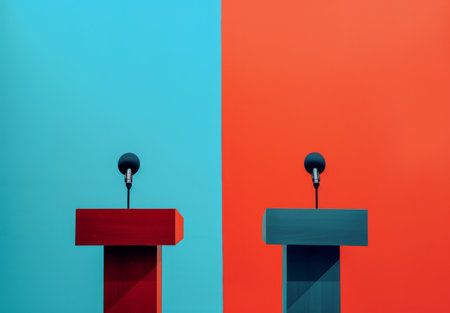 Two figures stand behind podiums, actively participating in a political debate. Bold colors and layered shapes create a dramatic backdrop.