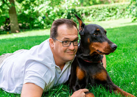 Man plays in the park with Dobermann