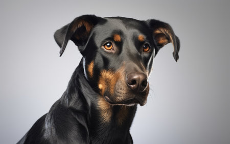 Close up of black and tan Doberman Pinscher dog with cropped ears looking alert against neutral gray background by Generative AI
