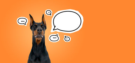 Beautiful Dobermann dog head with mockup copy space empty speech bubble, orange wide format background. Concept of communication, message, animal and choice
