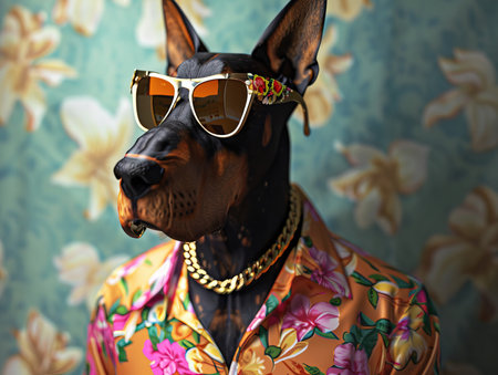 Doberman portrait on the meadow Photorealistic, miami vice style, Doberman Pinscher, sunglasses, floral shirt, gold chain