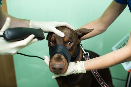 Veterinary inspection of the dog Doberman. Preparation for surgery