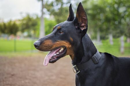 Portrait of black Doberman Pinscher dog in the park