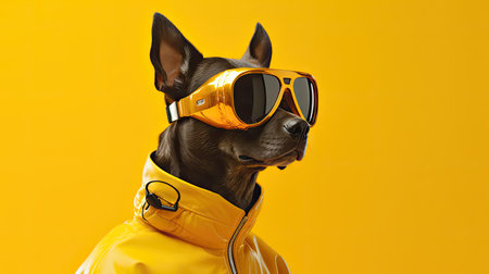 An AI generated illustration of Adorable canine wearing yellow raincoat and goggles against a bright yellow backdrop