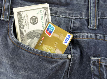 Romania -May 17,,2020 : Paxum plastic card in the back pocket of jeans . Concept of savings, during the financial crisis or card hacking prevention .