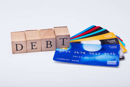 Close-up Of Debt Card And Debt Text On Stacked Wooden Block
