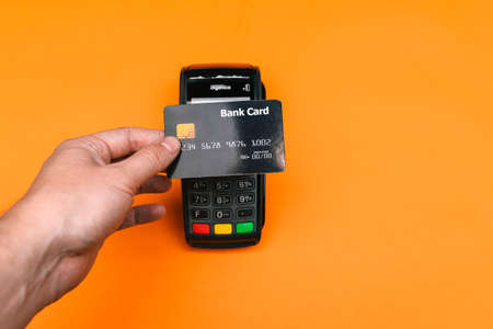 The buyer pays for the purchase with a bank card by placing it on the wireless payment terminal. Business and sales. Top view, copy space