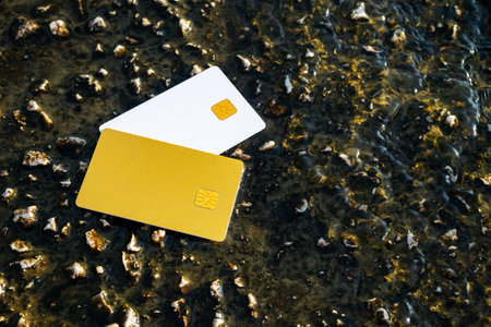 Golden and White Bank Card Lies On Stone Pier Covered With Water Moraitika, Corfu, Greece. The Concept Of Payment For Nature And Unlimited Possibilities. Copy Space