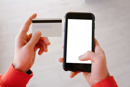 mobile technologies of online money management. convenient digital tools and apps to control your finances. credit or debit bank card and smartphone on the laptop. white blank phone screen.
