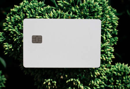 Close up credit bank black card on vibrant spring green fresh golf grass, sunshine lawn. Nature texture, green background for wallpaper. Soft focus. Field or finance concept design. Copy space