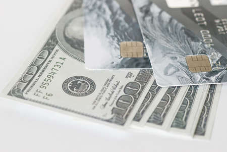 One dollar banknotes on a black table with credit cards. Cash money american dollars. Vintage background. Lens flare. American currency. Internet banking