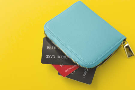 Moscow, Russia, January 17,2021 - Few credit cards (Visa, Mastercard and Mir) in the leather vintage wallet coin-box at wooden table, product concept shot.