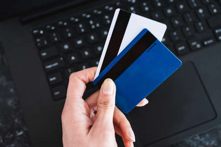 online shopping or internet banking concept, hand holding payment cards with unfocused laptop keyboard in the background
