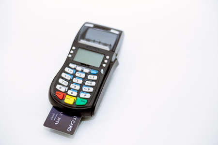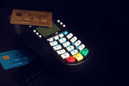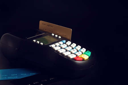 shoping electronic payment device reader machine with gold premium credit card of digital banking investment financial and money concept on black background