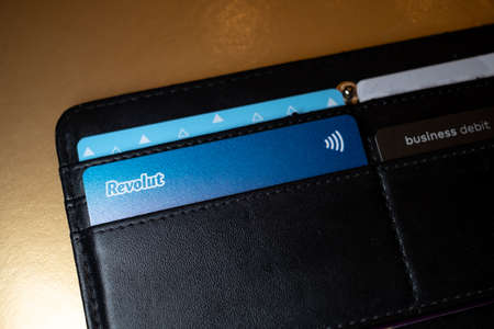 Bucharest, ROMANIA - May 17, 2021: Illustrative editorial concept image of a person holding a Revolut VISA card.