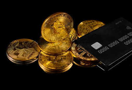 Golden coin with bitcoin logo and credit card. Leader in cryptocurrency BTC and bitcoin rewards card against black surface. Decentralized digital currency. Crypto payment. Electronic money or e-cash