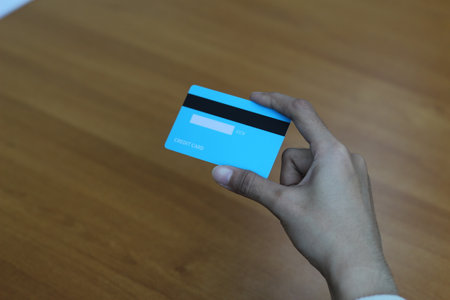 A person holds a light blue credit card. The card rests on a wooden surface.
