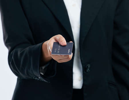 Asian women hold credit cards. Give credit to the camera. Spend via credit card. Credit card mockup