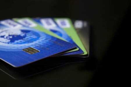 Close up of credit cards stack on wooden surface. Bunch of payment cards with biometric card lying on the top. Concept of paying for purchases using fingerprint scanner. User-friendly technology.