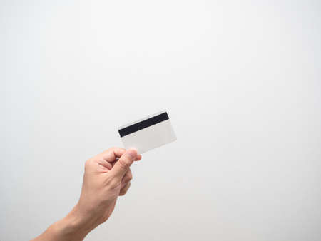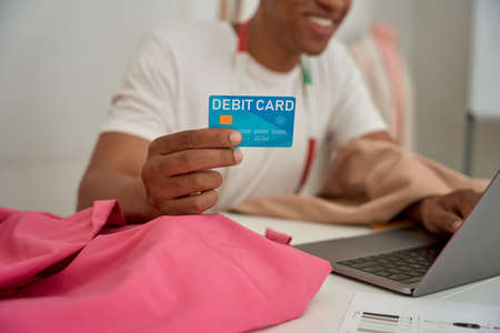 secure shopping with credit card. easy checkout and money management. man holding plastic card.