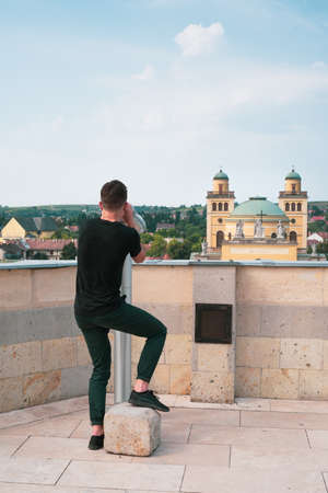 Tourist young man watching the city Eger through a telescope