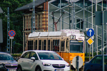 Budapest Hungary july 12, 2020 View of a traditional Hungarian electric tram for passengers driving through the streets and part of the public transport system of Budapest, the capital of Hungary