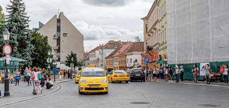 Timisoara, Romania - September 26, 2017: People enjoy warm autumn evening in Victoriei Square, Old Town of Timisoara, Romania