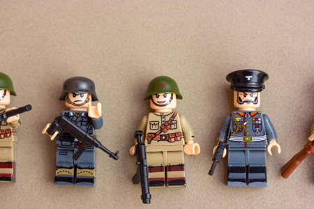 Kyiv, Ukraine. March 9, 2022. LEGO soldiers Second World War. Toy soldiers in uniform with machine guns weapons. Troops. War military exercises. Formations of the armed forces on brown background.