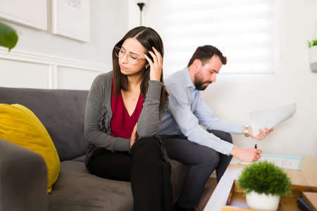 Couples with financial problems Being in a stressful mood and finding a solution for family financial problems, Need to talk about financial plans with financial advisors.