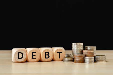 Debt financial concept. Text debt on wooden cubes with coins. business finance investment credit management.