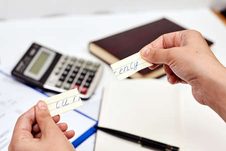 Man tearing paper with word - currency. Symbol of national currency breakdown. Financial Crisis. Currency denomination.