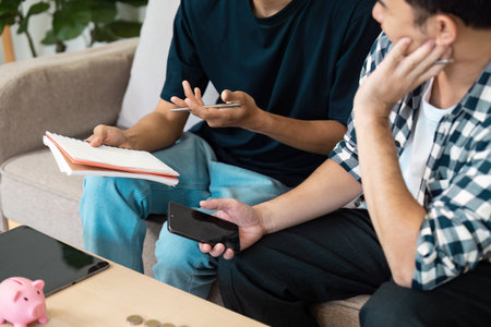 LGBTQ couple discussing financial goals while reviewing notes and using a smartphone.