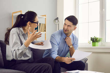 Financial problems in marriage. Angry wife and husband quarreling and shouting sitting on sofa at home. Couple fighting over money, high domestic utility bill, unpaid debt, huge family budget expenses
