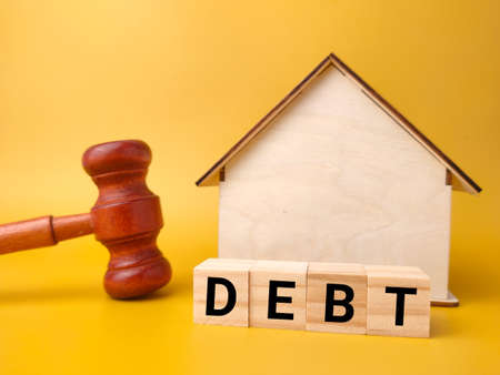 Wooden dices are arranged in a word DEBT, The crisis of a high burden of consumer debt.