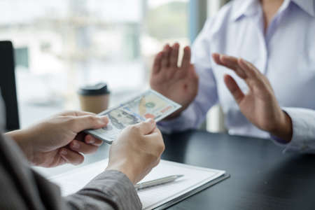 Businessman hand give the bribe to government officials who raise the hand refusing money the concept of corruption and anti-bribery.