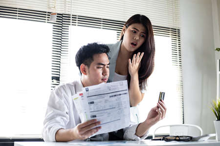 Stress young family couple worried about overwhelming and massive credit card bill or final mortgage loan notification. Modern family financial crisis from over spending online shopping. Unveiling