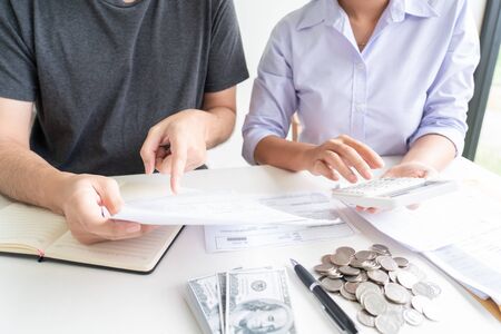 couple working saving account book and calculating her monthly expenses on calculator to calculate financial data, filling in individual income tax return